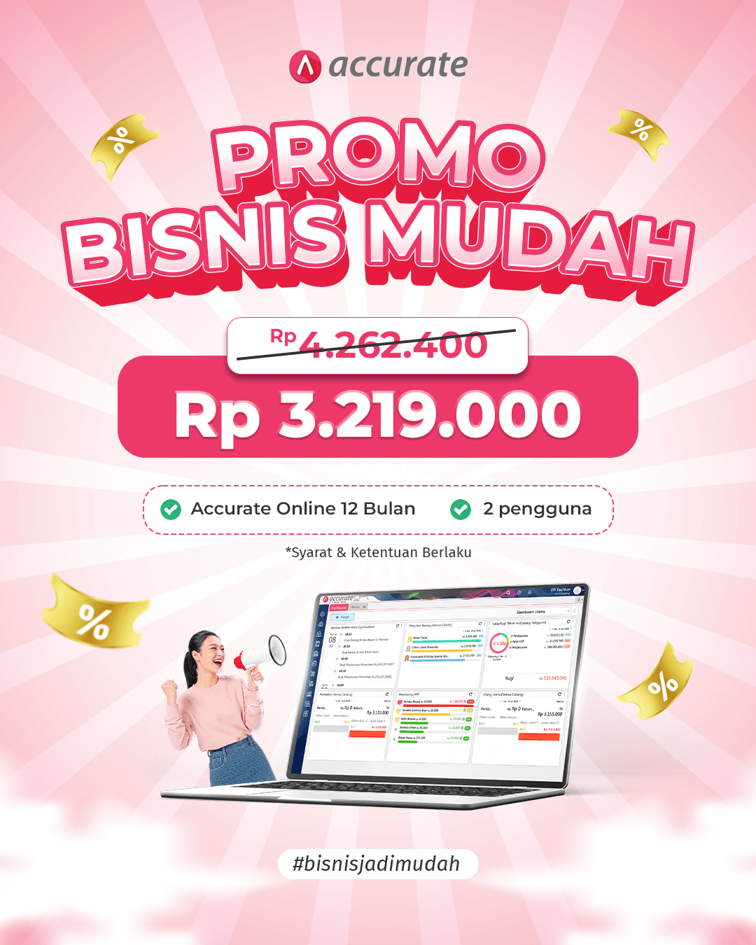 Dapatkan Promo Spesial Potongan Harga Rp. 1.032.400 Accurate Online 1 Tahun : Harga Spesial Rp 4.242.400 dari harga normal Rp 3.219.000 – Include 2 User – Training Online 2 Jam.